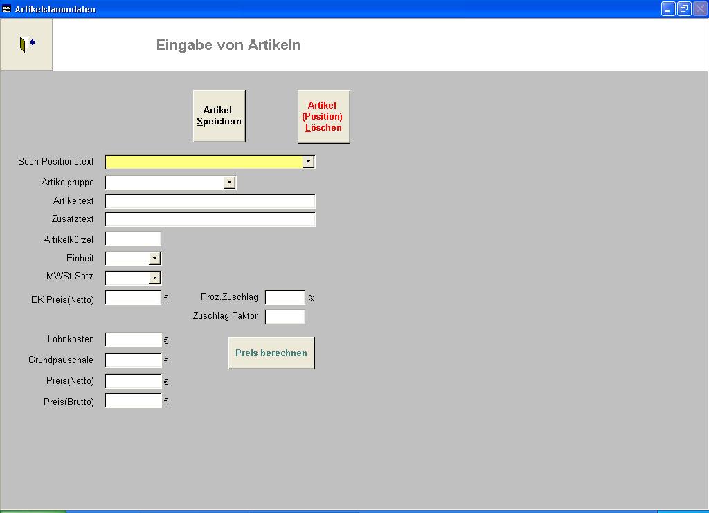 Die Artikel werden nach Gruppen angelegt und mit Artikeltext sowie Zusatztext (muss nicht unbedingt), Einheit, Mehrwertsteuersatz, Einkaufspreis, event. Aufschlägen, Lohnkosten und Verkaufspreis erfasst.