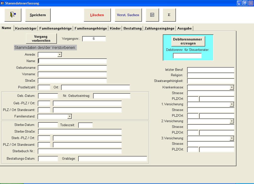 Das sich öffnende Formular unterteilt sich in mehrere Bearbeitungsbereiche. Als da wären, die Verstorbenendaten, Kostenträger, Familienangehörige, Kinder, Bestattungsdaten und ein Ausgabenaktenreiter.