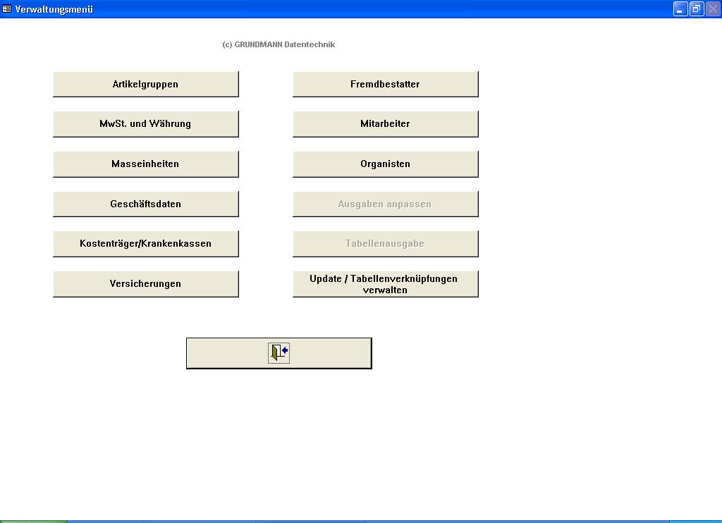 Im Verwaltungsmenü finden Sie die Möglichkeit die Firmenrelevanten Daten einzustellen oder aber Krankenkassen und Versicherungen in das System aufzunehmen. Desweiteren haben Sie die Möglichkeit Artikelgruppen, Masseinheiten, die Mehrwertsteuer, die Währung und einige andere Grundeinstellung vorzunehmen.